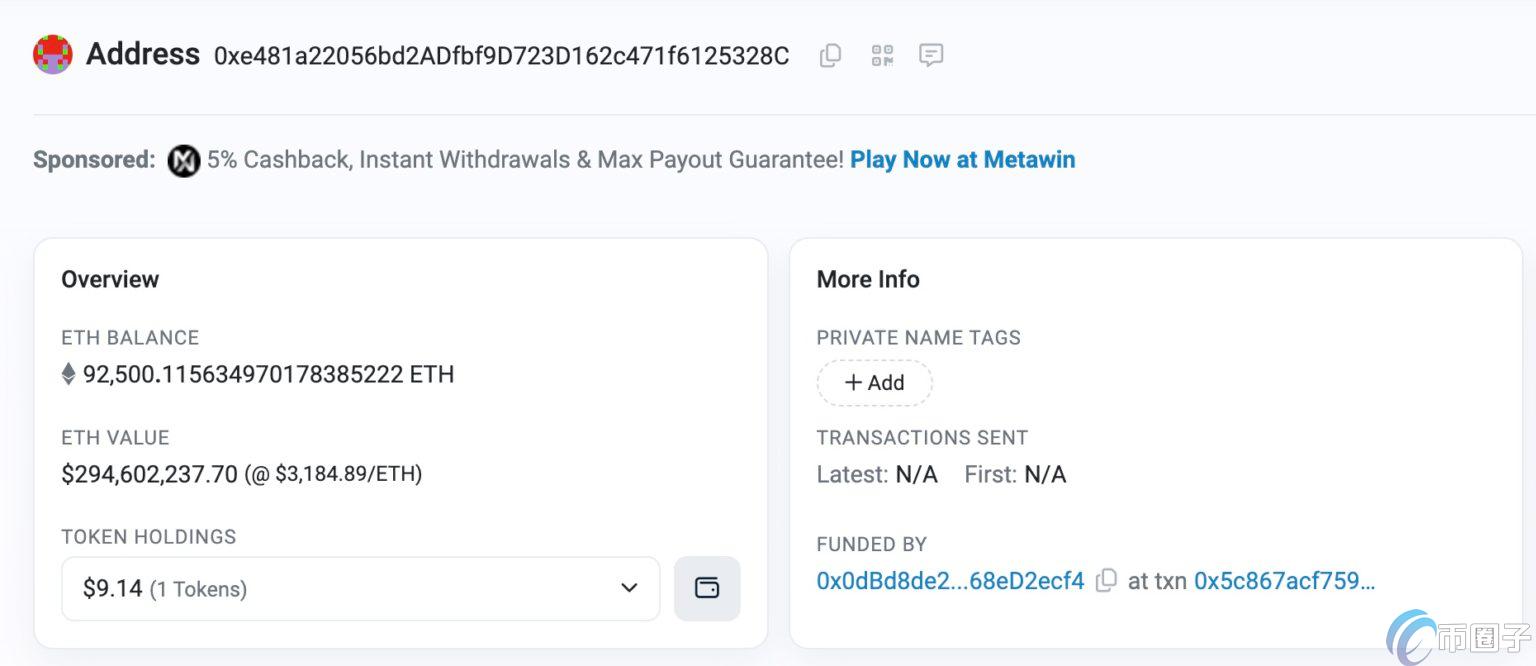 本站(120btc.com):根據區塊鏈追蹤頻道whalealert在昨晚11:39警示,有一個地址(0x0db)在休眠7年后首次轉移大量資產,高達92,499枚eth(約2.9億美元)。目前這些以太坊仍在0xe48..開頭的錢包中存放,截搞前尚未被轉移到交易所或有更新動作。