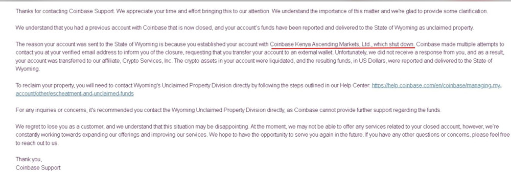 Coinbase官網相關解釋說明,視各州法律,3~5年未有活動的賬戶會被歸類為Unclaim Property,然而,該名網友今年2月和3月均有登陸,所以他認為Coinbase客服給的理由純屬胡扯。在網友持續詢問并且提供登入證明后,Coinbase客服表示,他們也愛莫能助,只能請網友自行去找懷俄明州無人認領財產部門要回資產。