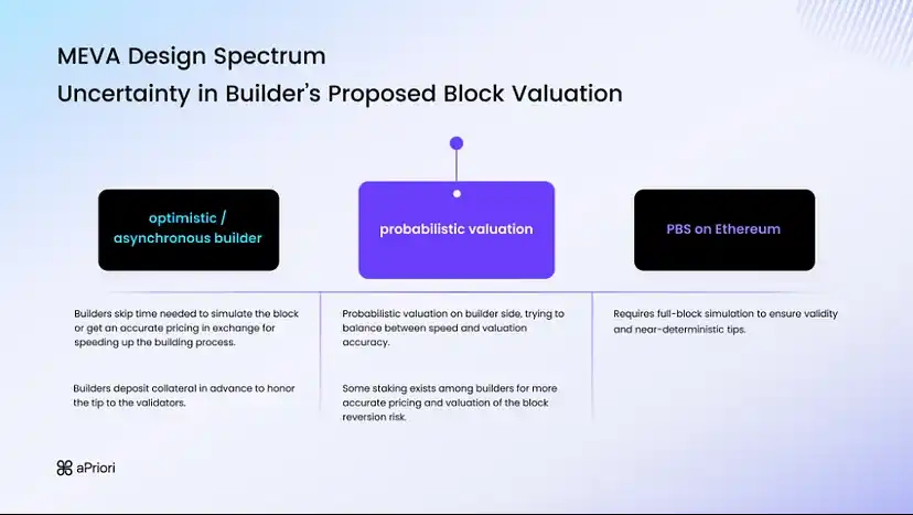 aPriori 提出了一種新的 MEVA 設計范式:概率校驗(probabilistic valuation)。該方案采用部分區塊拍賣,使構建者可以從搜索者提交的包中構建區塊的頂部,而驗證者則從公共內存池中附加剩余的交易。這種方法極大地降低了延遲,最大程度上適配 Monad 的性能。