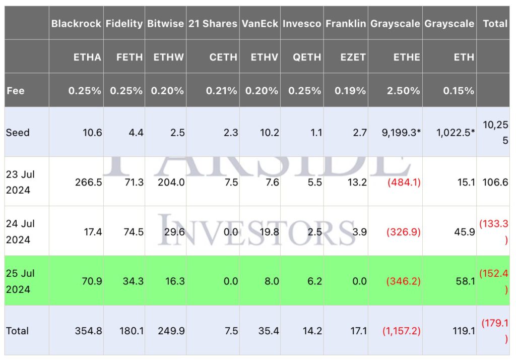 本站(120btc.com):以太坊現貨etf于23日晚間正式上市交易,根據farside investers數據,由于灰度的ethe持續呈現龐大的賣出,導致三天下來總共凈流出1.79億美元。