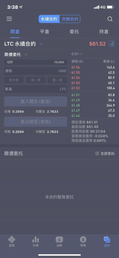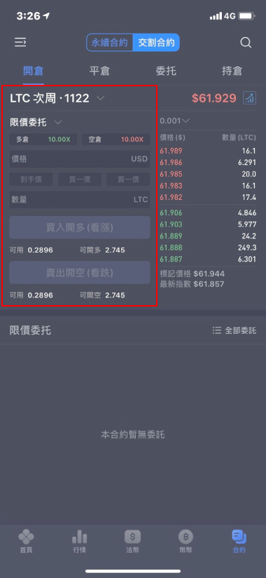 設置完成后選擇合約類型。例如我們選擇LTC次週合約,在選擇委讬類型、輸入價格、數量在選擇『買入開多』或者『賣出開空』即可。