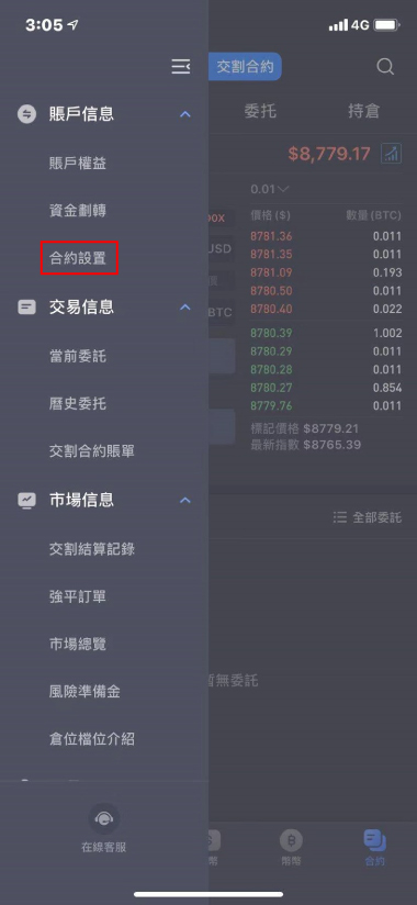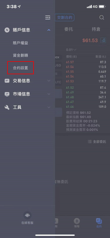 1.在合約交易裡選擇『永續合約』。點擊左上角進入『合約設置』。
