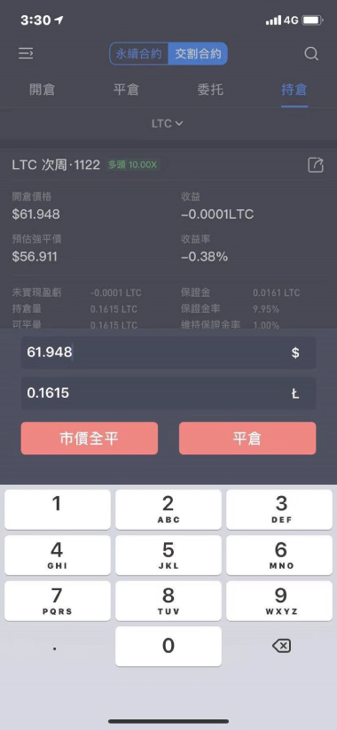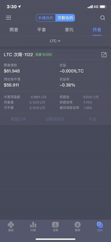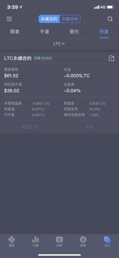 下單成功后可在『持倉』一欄內看到委讬單,可根據情況調整杠桿倍數。