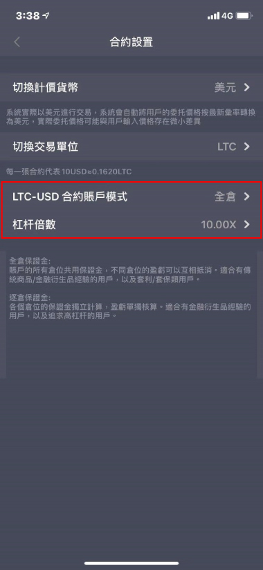 2.選擇帳戶模式『全倉』或『逐倉』、選擇杠桿倍數;當前最高可開杠桿倍數由您的持倉、掛單及開倉時新下的單張數決定,可在『倉位檔位介紹』內查看。