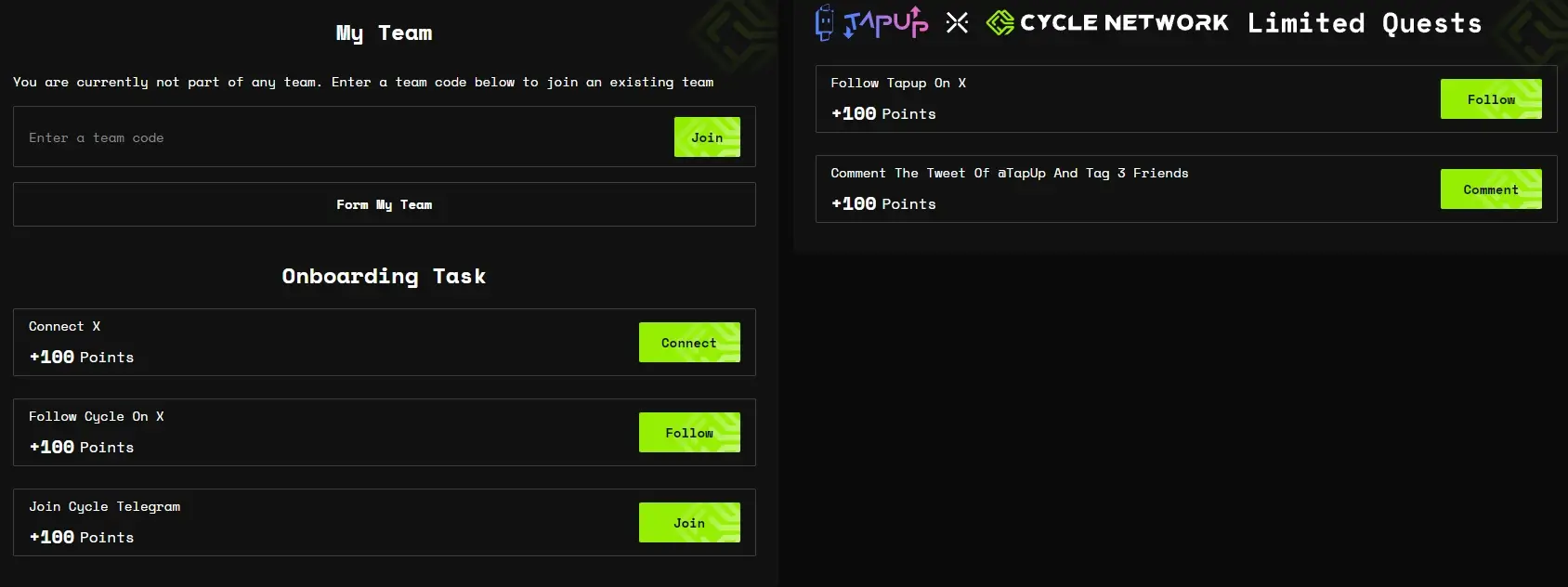 Cycle Network 目前的交互均為外部聯合活動,此前分別與 BEVM 、 Macaron 、 IoTex 等項目合作推出活動,最新活動為與 Tap U p 的聯合活動,完成任務能夠活動 Cycle 積分與 Tap U p 的 U 獎池。