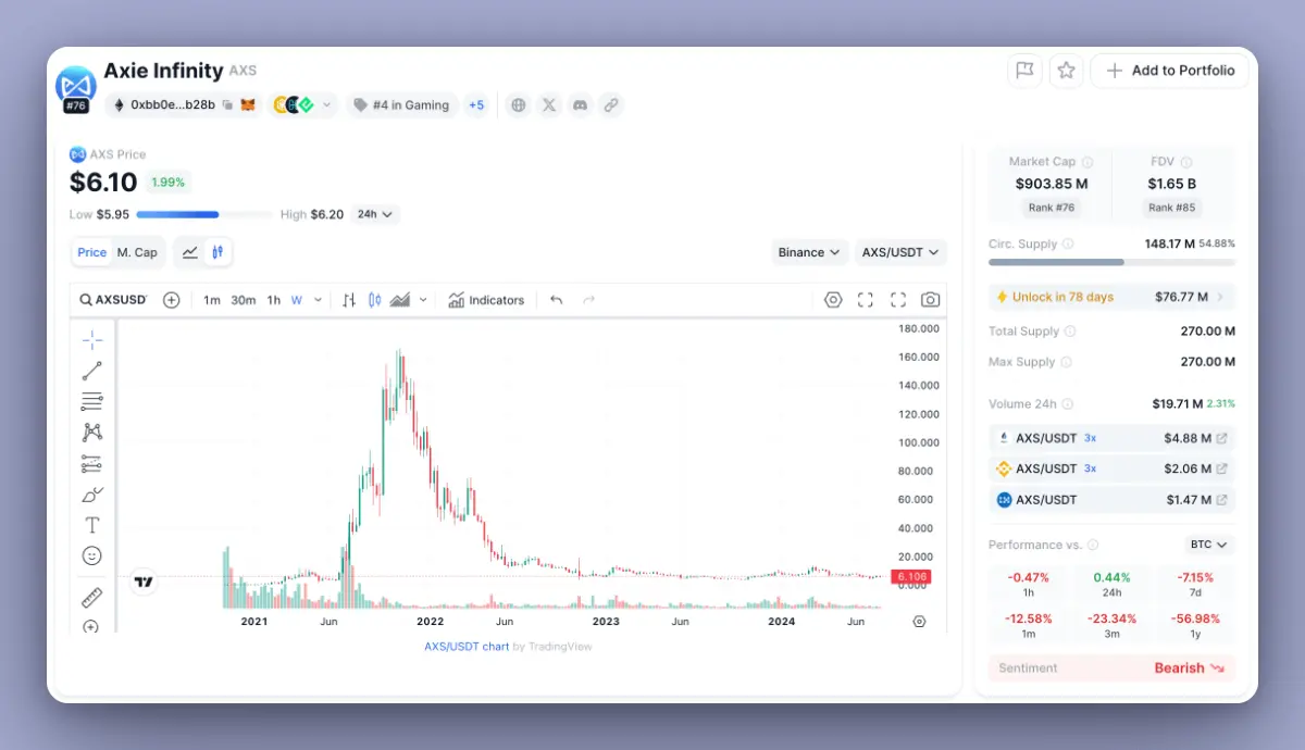 該類分析將有助于確定代幣是否值得持有,以及是否具備上漲潛力。但98%的山寨幣注定要失敗,因為它們根本沒有任何潛力。比如,如果你在2021年11月投資1萬美元AXS ,那么今天就只剩下382.5美元。