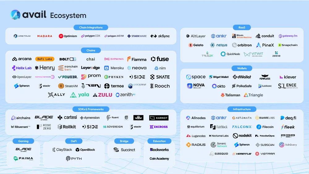 Avail 也在和應用鏈集成方面做出了進展,目前,已經集成了包括支付鏈 Fuse、預言機服務 OpenLayer、IaaS 協議 Neova、主打鏈抽象和意圖的 L1 Arcana 以及全鏈上游戲 Blade Games 等。