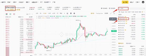 第4步:在右側搜索欄輸入幣種簡稱【ETH】,選擇【ETH/USDT】交易對。