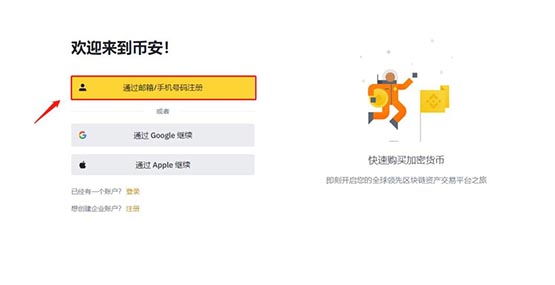 第1步:在幣安交易所首頁點擊【通過手機號碼/郵箱注冊】進入注冊頁面。
