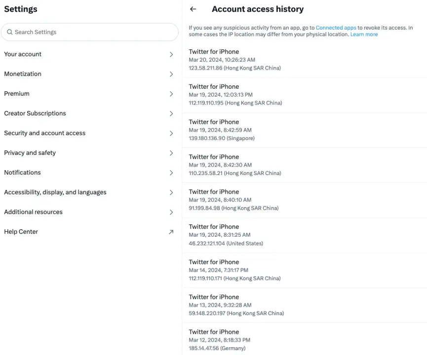 如下圖,進入 Account access history 可以查看登錄設備的型號,登錄日期,IP 和地區,如果發現異常登錄信息,則說明賬號可能被盜了。