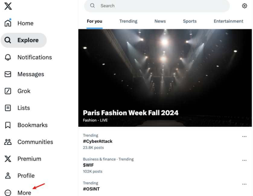 我們以 Web 端為例,打開x.com頁面后,點擊側邊欄的「More」,找到「Settings and privacy」選項,這里主要用于設置賬號的安全和隱私。