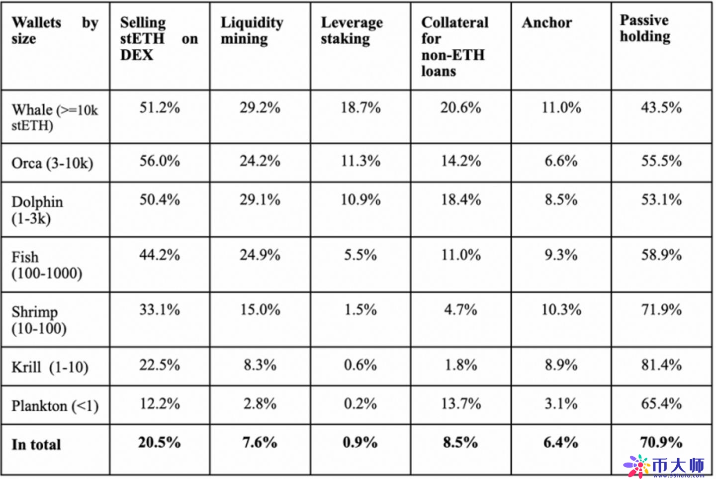 上圖為 Lido 官方統計的 stETH 用途,可以看到 passive holding 的人數占比是最多的,大約 70 %。對于巨鯨來說,用途相對更為廣泛,除了在 DEX 上賣掉以外,還會參與一些杠桿挖礦杠桿質押行為增加收益。而反觀持倉較少的地址,更傾向于單純的 Holding。這其實更加反映了流動性質押的衍生品用途廣泛對于該項目的重要性。