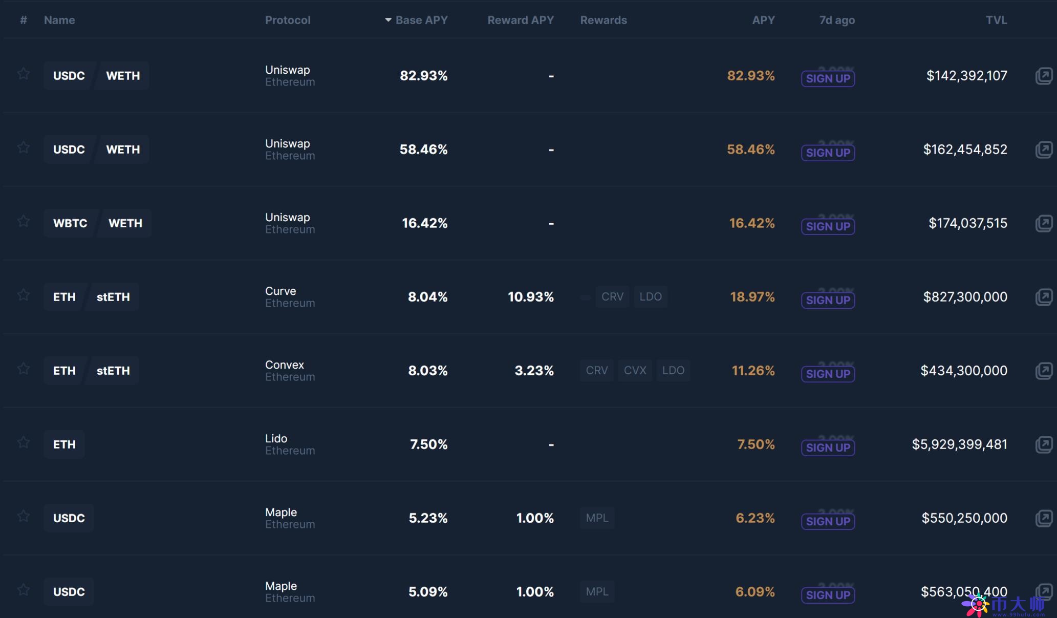 如下圖,以太坊上 TVL>100 M 的按 APY 從大到小排名的收益率,前三個都是 Uni LP。但別忘了文章開頭提到過,絕大部分 Uni LP 都是虧損的。而有關 的 APY,目前市場上能提供比 ETH 質押 APY 更高且穩定的地方的確不是很多,那么也就有理由相信,如果追求穩定的收益率,ETH staking 的確是當下最好的去處。 ETH-stETH 同屬該賽道衍生產品,下面的 Maple 則屬于無抵押借貸,想想暴雷頻發的市場環境下,這種賽道有多危險。