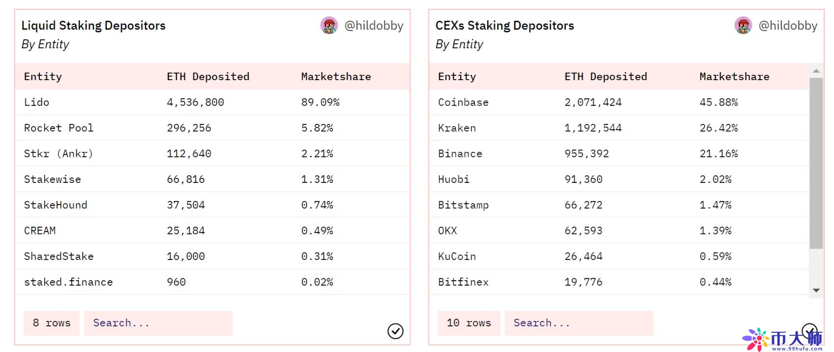 Lido 質押量占以太坊質押總量的足足 30.36 %,質押約 453 萬枚 ETH(以太坊總質押量 1500 萬枚 ETH),第二名 占比 13.87 %,質押約 200 萬枚 ETH,Lido 足足領先了第二名一倍有余。且 Lido 質押量相當于 Coinbase、、Binance 三個 CEX 的總和( 421 萬枚 ETH),還要多。