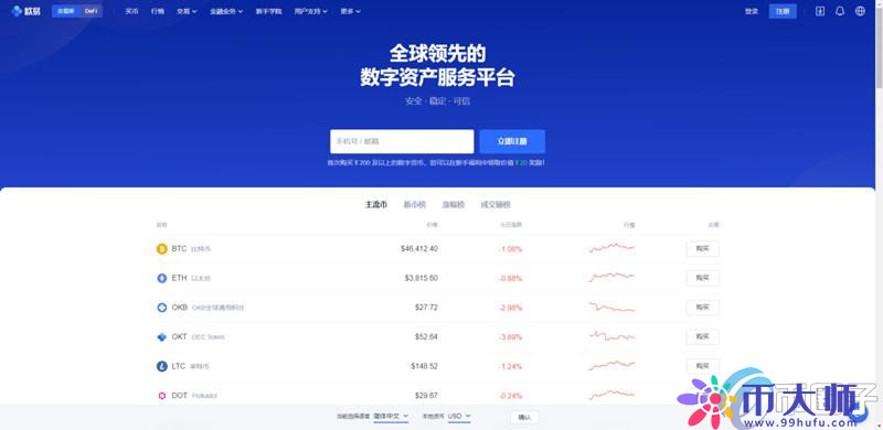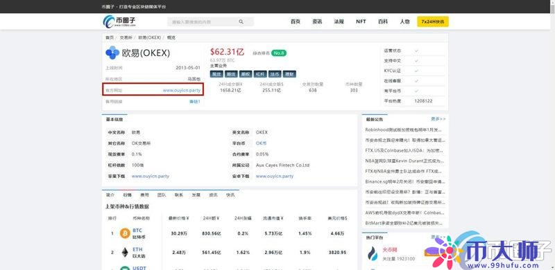 1、打開幣大師網站(https://www.99hufu.com/),進入后在輸入欄中輸入歐易交易所