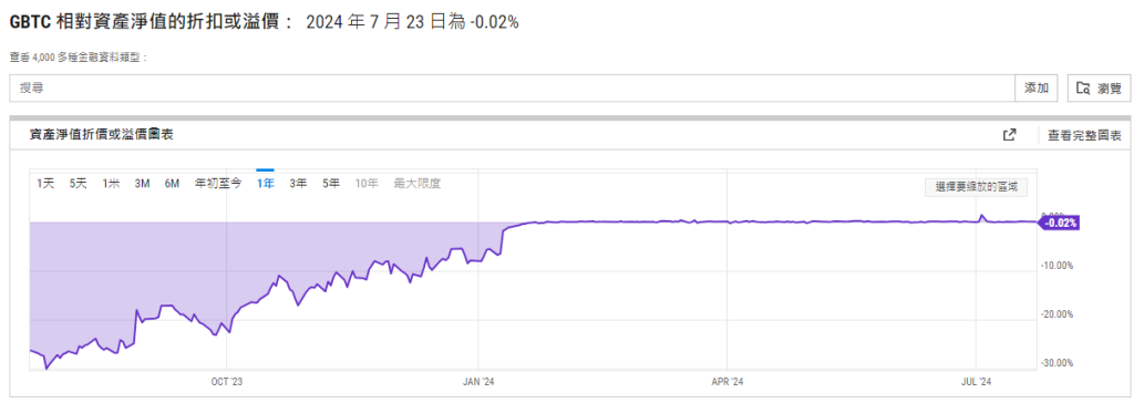 根據(jù)YCharts的數(shù)據(jù),GBTC于推出前1/9的-6.53%緩步回升,至1/22為-0.11%。