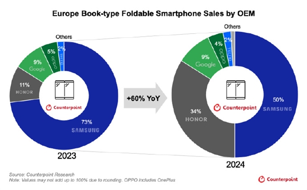 2024年,榮耀憑借Magic V系列迅速崛起,市場份額從2023年的不足10%躍升到34%,而三星從73%降至50%,直追三星,打破三星長期主導格局。