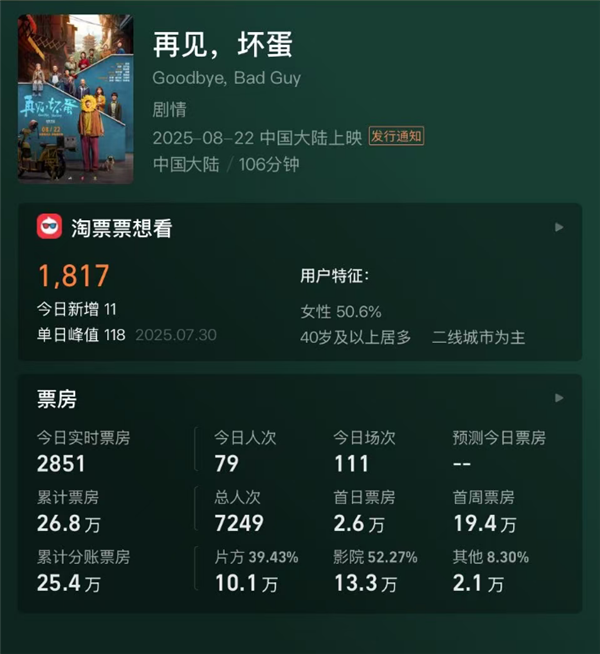 電影《再見,壞蛋》于8月22日上映,上映6天票房僅26.8萬元。
