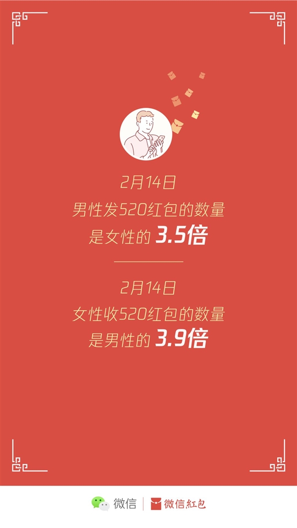 其中,男性發520紅包的數量是女性的3.5倍,女性收520紅包的數量是男性的3.9倍。