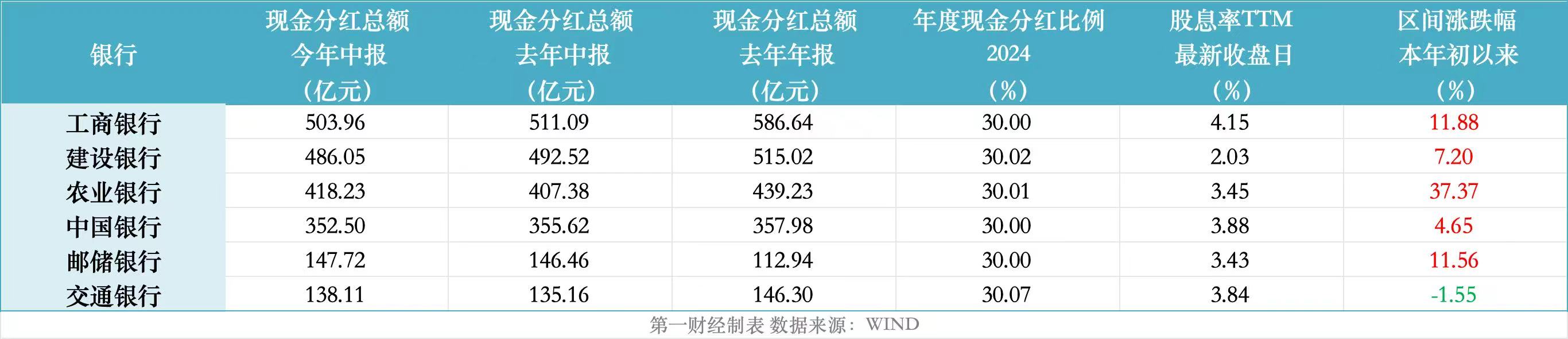 中國銀行計劃按照每10股人民幣1.094元(稅前)分派普通股現金股利,派息總額為352.50億元(稅前);交通銀行擬每10股分配現金股利人民幣1.563 元(含稅),合計分紅金額為138.11億元;郵儲銀行擬每10股普通股派發中期現金股利人民幣1.230元(含稅)股計算,總額147.72億元(含稅)。