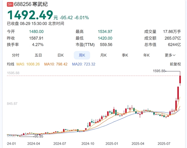 8月28日,寒武紀股價大幅收漲15.73%,收于1587.91元/股。值得注意的是,寒武紀當日收盤價超越貴州茅臺的收盤價格1446.1元/股,收盤價首次位居A股第一。