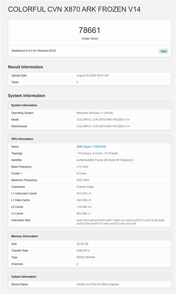 在Geekbench的測試中,銳炫Pro B50的Vulkan測試得分達到了78661分,而OpenCL測試得分則為69890分。