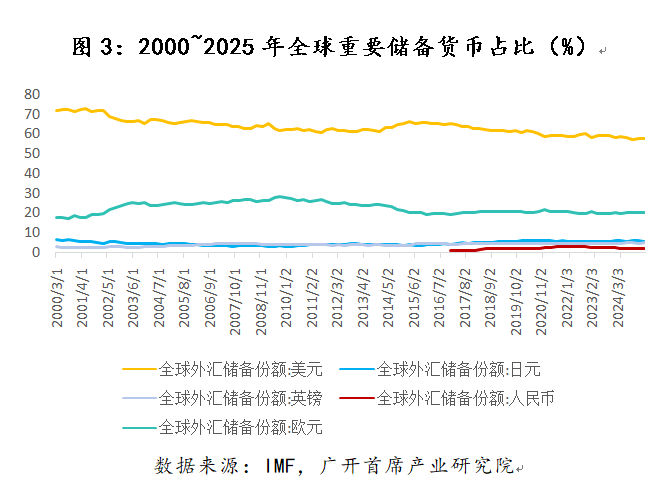 從全球儲備貨幣功能看,IMF統(tǒng)計數(shù)據(jù)顯示,自2000年以來,美元在全球外匯儲備中的份額已從72%左右降至2025年一季度的57.74%。與之形成鮮明反差的是,歐元、日元、英鎊、人民幣等非美貨幣的份額在此期間都有了不同程度的增長,國際貨幣體系呈現(xiàn)出蓬勃的多元化發(fā)展趨勢。