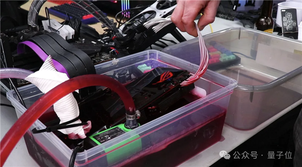 把顯卡的外殼和風扇拆掉,放進塑料盒里,倒入紅亮的變速箱油,接上主板的線,齊活!