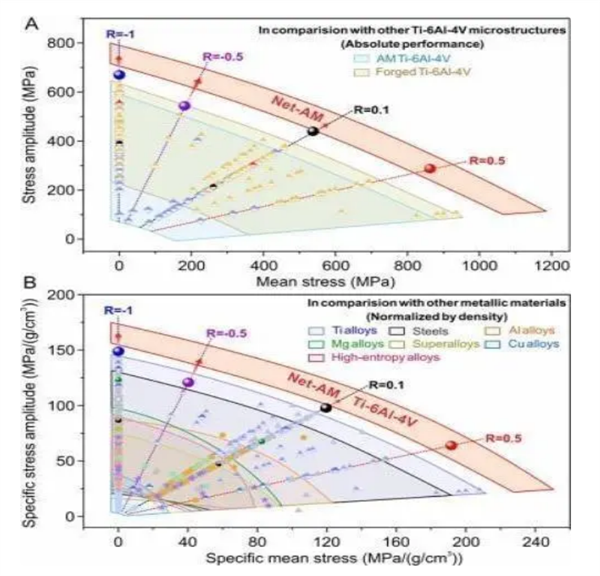 2024年初,該團隊發明了一種稱為“凈增材制造”(Net-AM preparation,NAMP)的新工藝,可精確控制材料內部結構及缺陷。利用該工藝制備的常用鈦合金Ti-6Al-4V,成功同時消除了微孔和粗大組織——這兩者正是引發疲勞破壞的主要因素。新材料在“拉-拉”循環應力條件下,其“比疲勞強度”(強度與密度之比,是評價輕質材料疲勞性能的關鍵指標)打破了世界紀錄,首次證明3D打印材料亦可具備頂尖抗疲勞能力。