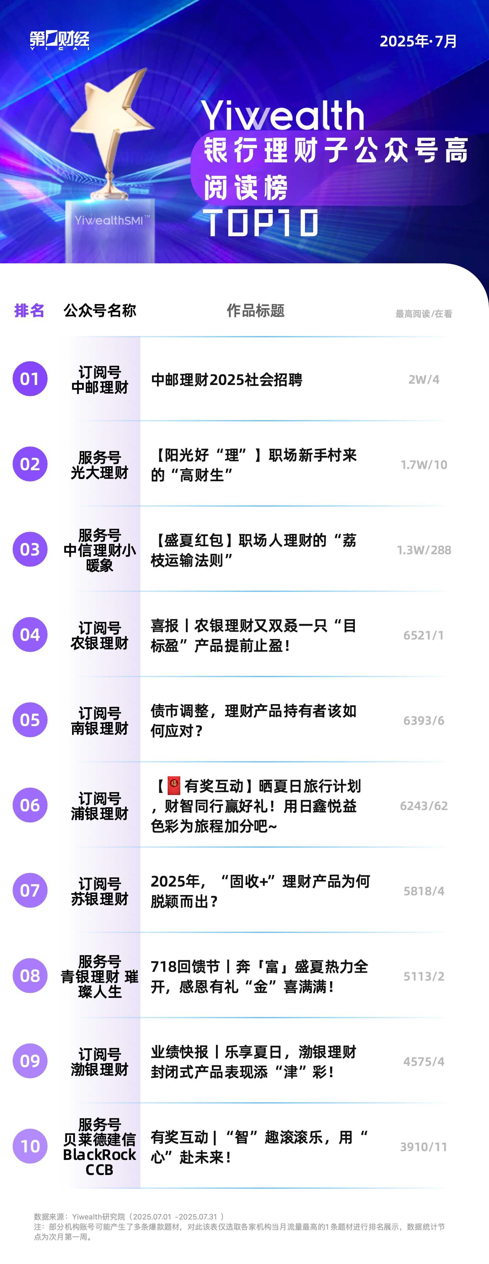 本期為銀行理財子公眾號榜(2025年7月)。