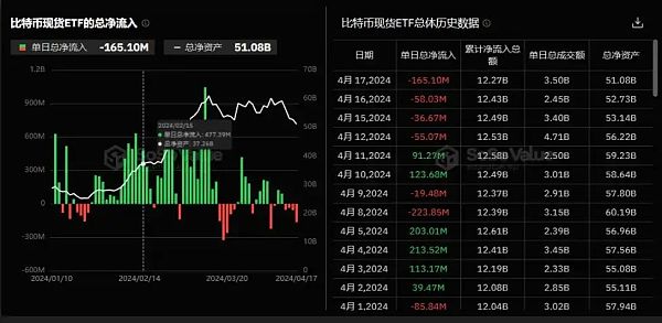 近期比特幣現(xiàn)貨 ETF 凈流出規(guī)模巨大,引發(fā)市場關(guān)注。據(jù)SoSoValue數(shù)據(jù)顯示,4月18日比特幣現(xiàn)貨 ETF 凈流出達到2315萬美元,已連續(xù)5日凈流出。截止目前,比特幣現(xiàn)貨ETF總資產(chǎn)凈值為524.1億美元,ETF凈資產(chǎn)比率高達2.82%,歷史累計凈流入更是達到了122.4億美元。